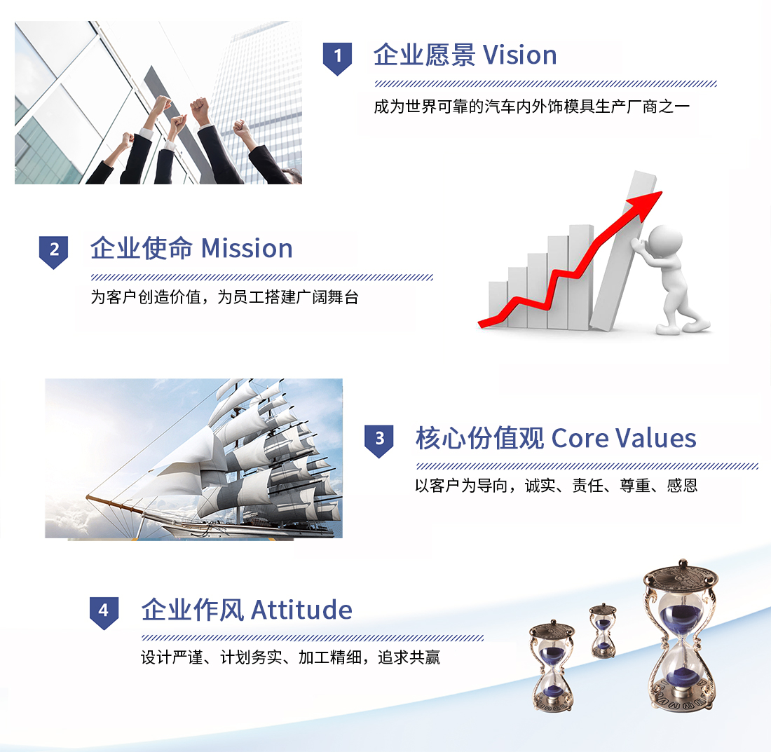 為(wèi)客戶創造價值,為(wèi)員(yuán)工(gōng)提供廣闊舞(wǔ)台,堅持綠(lǜ)色環保創新,成為(wèi)世界汽車(chē)模具企業(yè)之一(yī)